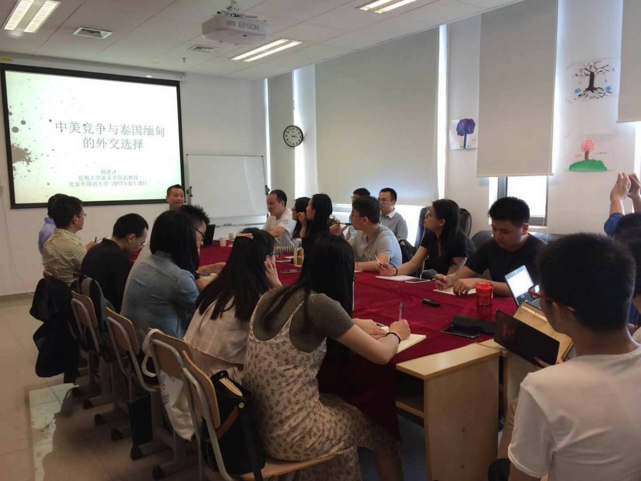 2017年5月15日下午3点至5点,北外国关学院在西院综合楼1151会议室举办了北外国关前沿沙龙第十六期活动,活动主题为“中美竞争与泰国、缅甸的外交选择”。本次活动邀请的嘉宾为伦敦大学亚非学院(SOAS,University of London)政治和国际关系学系副教授韩恩泽,尹继武教授主持,张效民副教授和史泽华副教授分别担任评议人,来自44118太阳成城和其他高校及研究机构的众多学者和同学也参与了讨论。