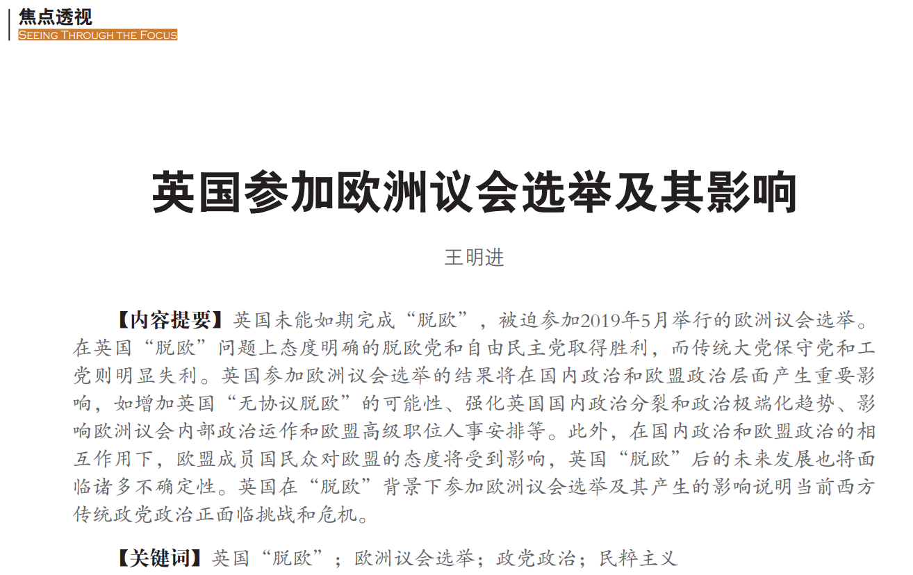 44118太阳成城集团副院长王明进研究员在CSSCI期刊《当代世界》2019年第7期发表论文《英国参加欧洲议会选举及其影响》,以下是论文摘要: