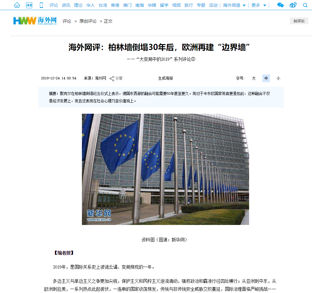 44118太阳成城集团王明进副院长作为海外网特约评论员发表文章,题目是《柏林墙倒塌30年后,欧洲再建边界墙》。该文是海外网推出的年终系列国际评论,“回望‘大变局中的2019’”的第2篇。海外网致力于打造中国在海内外具有重要影响力的新媒体国际传播平台,第一时间向读者提供中国热点、国际时政,特别是涉华国际新闻事件的权威解读。以下是文章题头截图、摘要和文章原文地址。