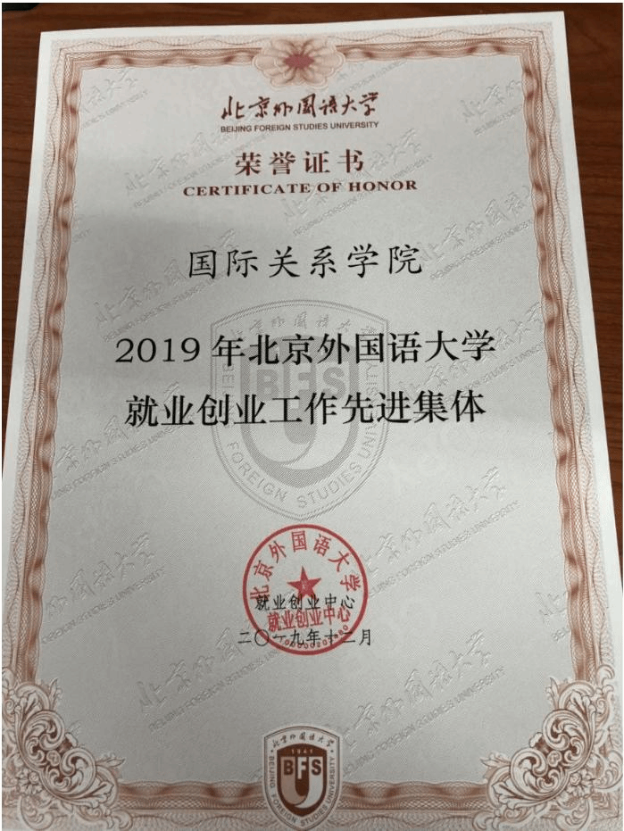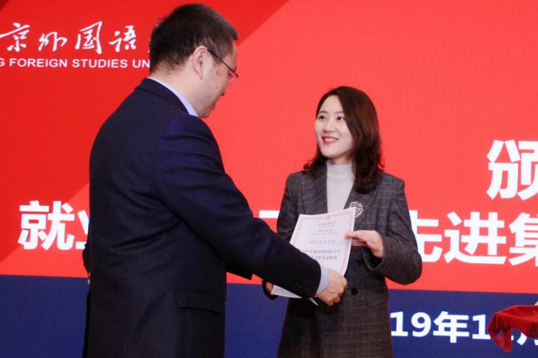 近日,44118太阳成城集团荣获2019年44118太阳成城就业创业工作先进集体称号。12月25日召开的北外2019年就业创业工作大会上,44118太阳成城杨丹校长向学院代表,44118太阳成城集团团总支书记、辅导员钱梦婷老师颁发荣誉证书。