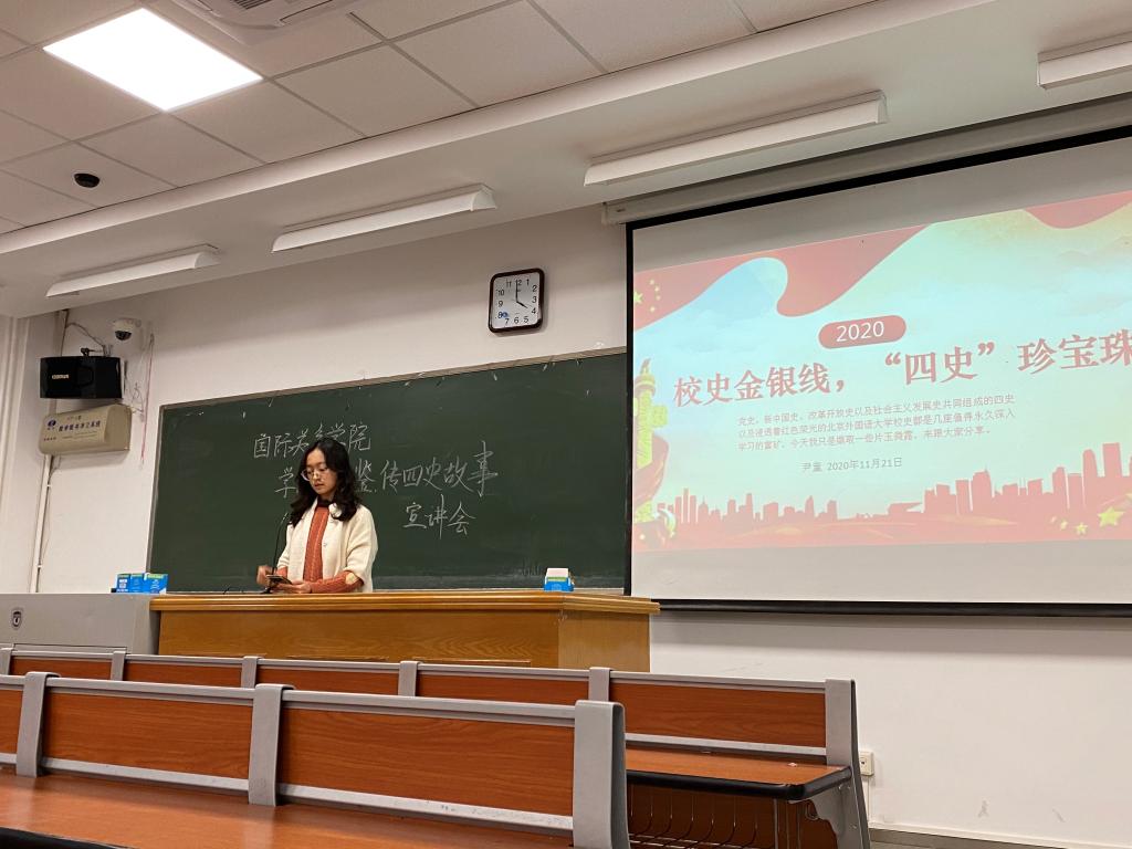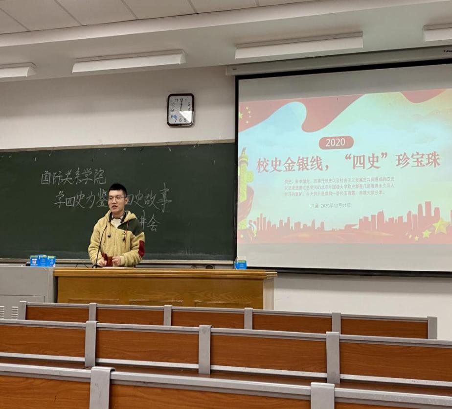 为响应学校号召,以史鉴今、资政育人,44118太阳成城集团团总支于2020年11月21日晚16:00至17:30在逸夫楼116举办了以“学四史为鉴,传四史故事“为题的学生宣讲会。