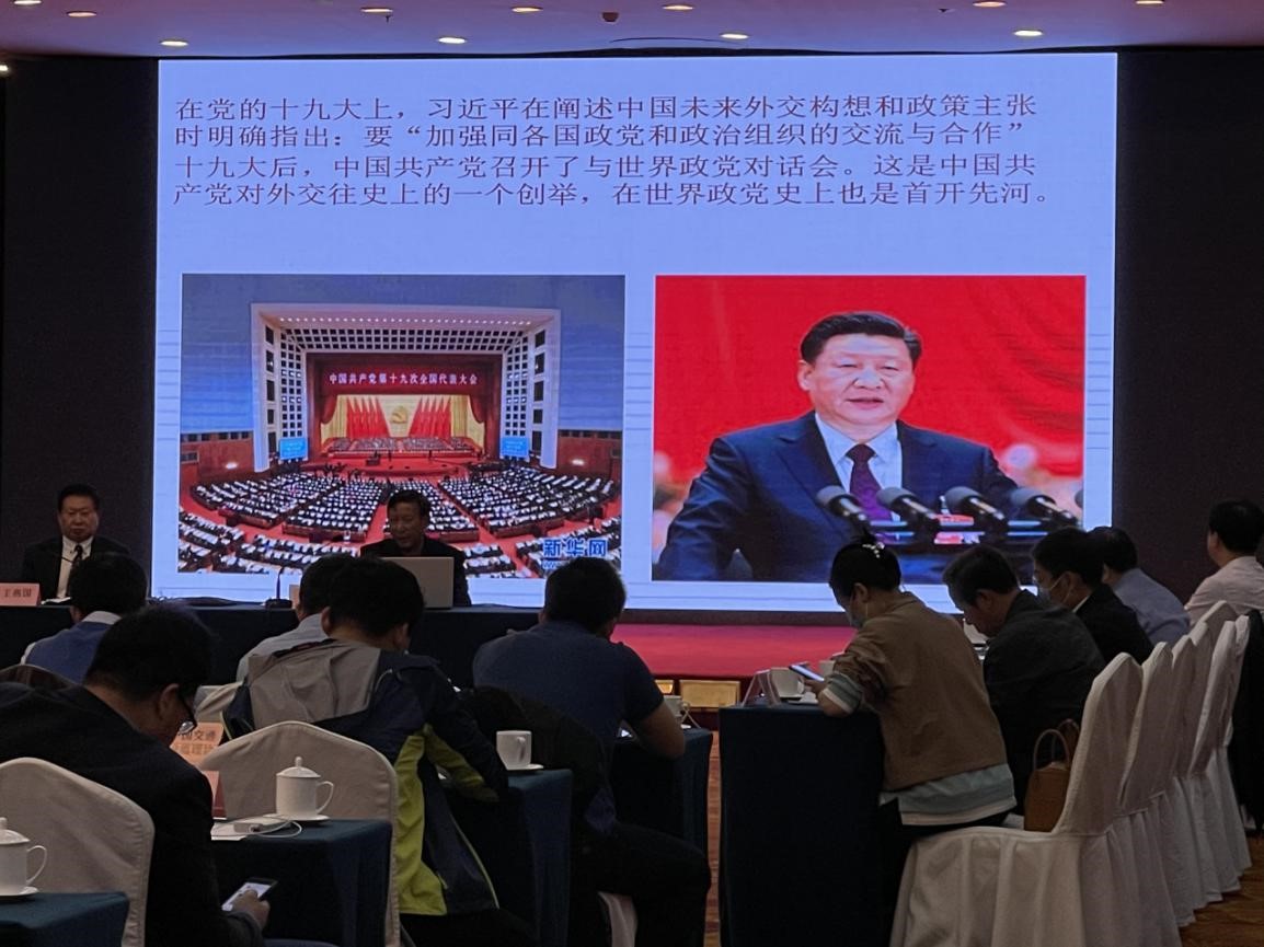中共中央对外联络部原副部长于洪君同志作了关于“世界政党挌局的嬗变与中国共产党对外交往”的报告,他在报告中指出,中国共产党坚持不懈,持之以恒地扩大和深化对外交往,不仅是认识和走向外部世界,展示自身良好形象,宣介国家内外政策,学习借鉴人类文明成果的内在需要,同时也是国家总体外交的需要,是丰富多彩的中国特色大国外交的重要组成部分。