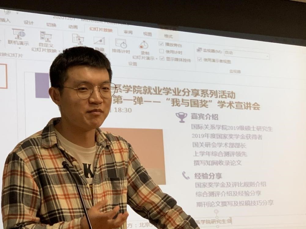 2021年5月17日晚,由北外44118太阳成城集团研究生会主办的“我与国奖”学术宣讲会于逸夫楼515教室成功举办。作为“就业学业分享系列活动”的第一期,本次宣讲会邀请了上年度国家奖学金获得者——2019级国际政治专业硕士研究生尹童,给来自于44118太阳成城集团和国际商学院的诸位同学分享了他的学习和学术经验。