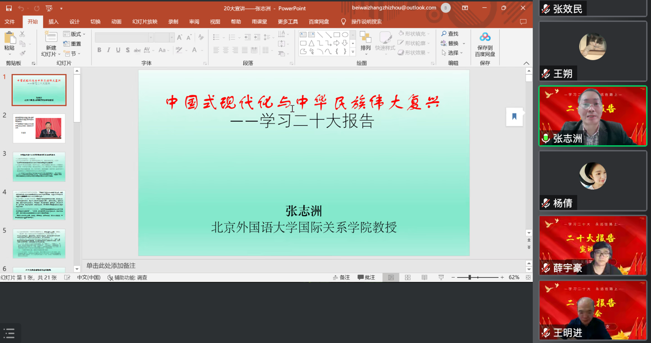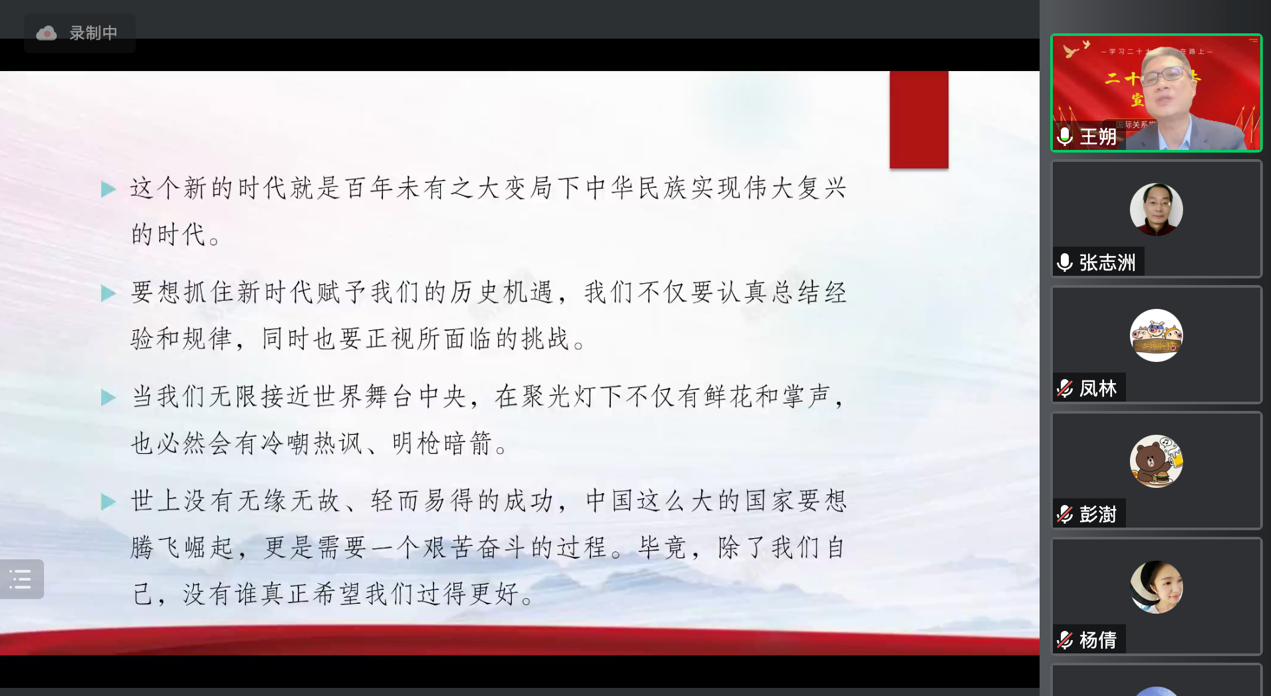 张志洲老师结合二十大报告,做了“中国式现代化和中华民族伟大复兴”的主题宣讲。首先张志洲老师总体介绍了二十大报告的构成与内容梗概。结合自身研究,从专业的角度逐条分析如何成为新时代中国特色社会主义的接班人。张志洲老师阐释,我们正处于一个承前启后、接续奋斗的历史节点,中国共产党领导已取得举世瞩目的成就。党对我国的发展有着清晰的规划和发展蓝图,如“二十大是对十九大奋斗目标的接续”,是对未来五年中国发展的总部署。当前我们正处于实现中华民族伟大复兴的关键时期,只有坚持中国共产党领导,以中国式现代化来推进中国的现代化建设,才能保证中国伟大复兴之路顺利前进。