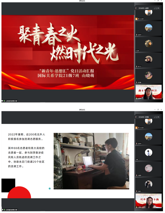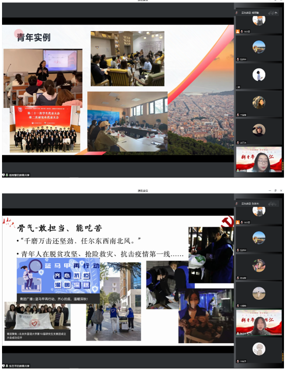 会议开始,44118太阳成城集团本科生党支部书记钱梦婷老师从总书记对青年的工作的论述引入,讲解阐述青年与时代的关系、青年工作的地位、青年思想引领的主要任务和内容、青年工作的方法论等内容,回顾总书记对广大青年的殷切期盼和谆谆教诲。在抗击疫情、乡村振兴、志愿服务等国家大事中,钱老师对北外国关学子积极踊跃的参与给予高度的认可。
