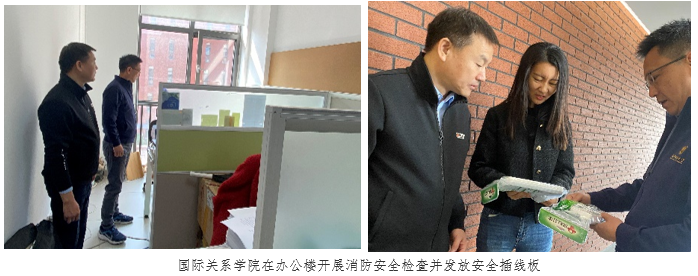 学院党总支书记张效民、院长谢韬带队首先在国内大厦1号楼开展消防安全检查,对学院各办公室逐一走访检查,对于发现的插线板老化、热源附近堆放物品等消防安全隐患,要求及时清除、立即整改;不能现场处理的其他问题记录在案,做好台账管理和更新,限时整改。