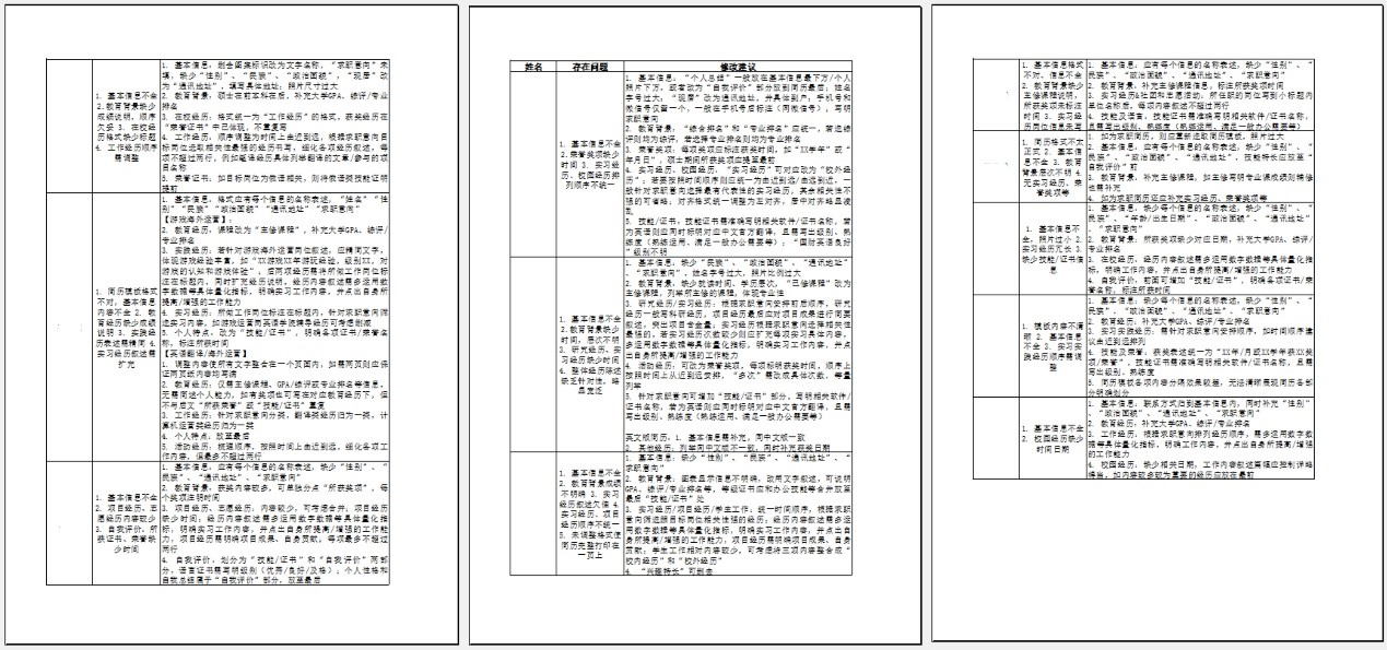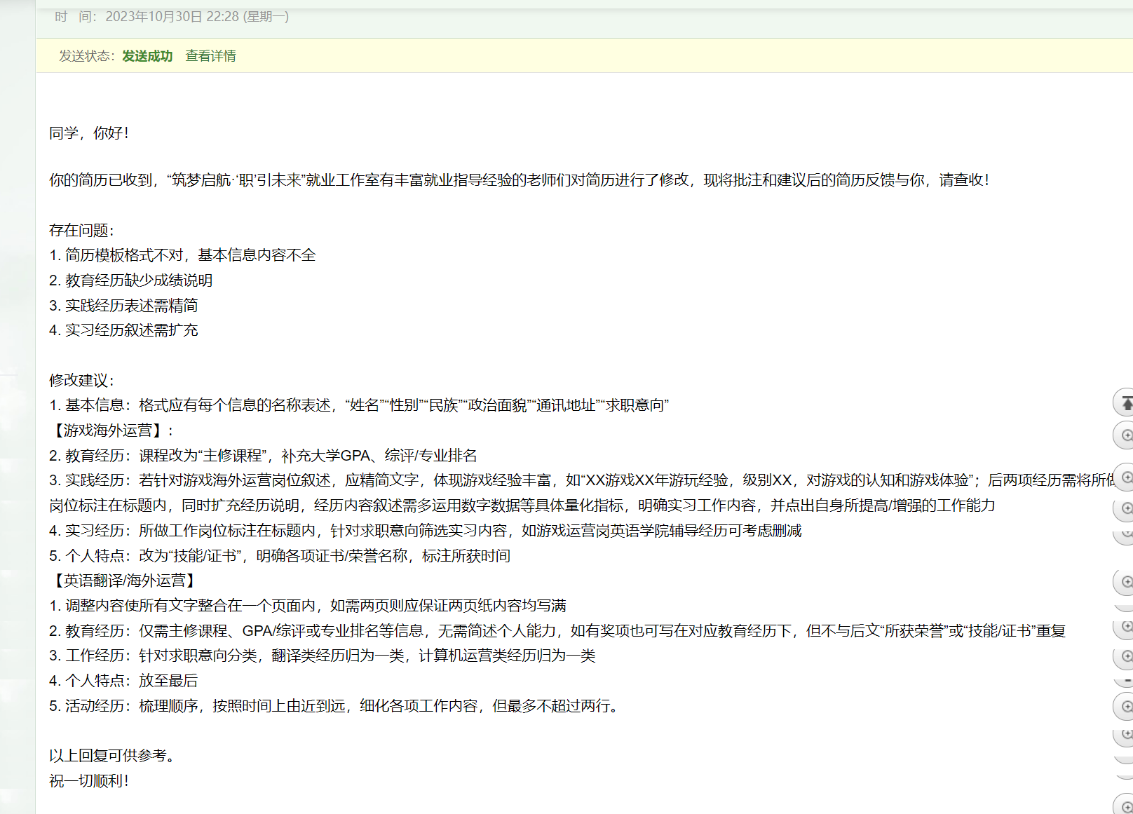 本次活动经工作室团队的精心筹备,由法学院辅导员刘时剑,阿拉伯学院辅导员杨一凡,44118太阳成城集团辅导员钱梦婷、褚静璇对同学们的简历进行细致详尽的修改,汇总成完善的修改建议,最终由工作室团队以邮件形式向同学们提供“一对一”的反馈。