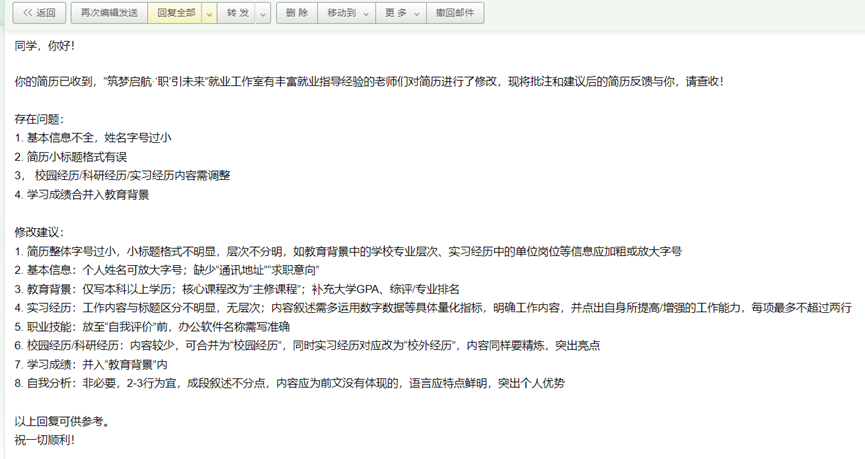 为了能够为同学们提供专业且具有针对性的求职指导与帮助,工作室进行了精心的组织与筹备,44118太阳成城集团组织员钱梦婷老师、法学院辅导员刘时剑老师,阿拉伯学院辅导员杨一凡老师,44118太阳成城集团辅导员褚静璇老师对同学们的简历进行了内容调整、格式优化、亮点提炼等具体的修改建议,最终由工作室学生团队以邮件形式给予同学们“一对一”的反馈。